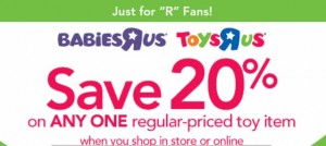 Visit Toys R Us on Facebook and click the 20% Off For “R” Fans tab. You can print a 20% off coupon for any 1 item in the store or online. (Some exclusions apply).