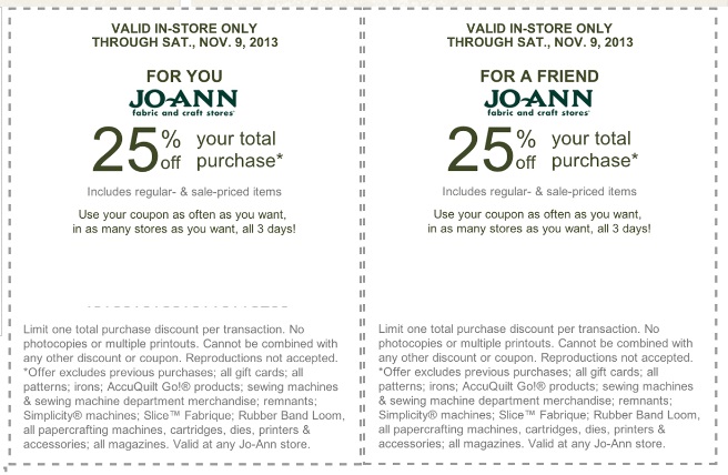 Have a project in the works?  If you still need to buy supplies, or are looking to pick up some great gifts for the creative people in your life then head to Joann stores 11/8 or 11/9 with these Joann printable coupons!