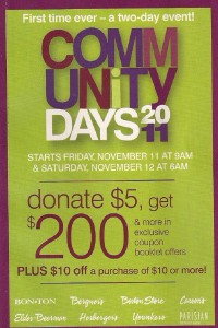 Have you heard of Community Days? It’s a coupon booklet/program that happens once a year and is sponsored by the following department stores: Younkers, Elder-Beerman, Bon-Ton, Bergner’s, Boston Store, Carson’s, Hergerger’s and Parisian (Detroit area). You simply purchase a coupon book for $5 and that coupon book includes (1) $10 off coupon on a regular or sale price item of $10 or more throughout the store including brands that rarely go on sale.