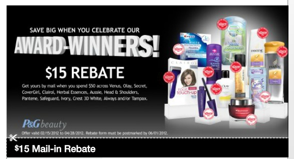 For spending $50 on Always, Aussie, CoverGirl, Clairol, Crest 3D White, Herbal Essences, Ivory, Olay, Secret, Head & Shoulders, Pantene, Safeguard, Tampax and Venus. they will give you $15 back!