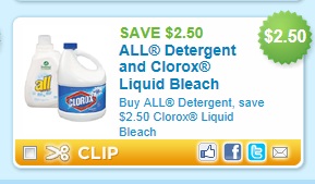 There is a nice high value coupon available for $2.50 off Clorox and All detergent.