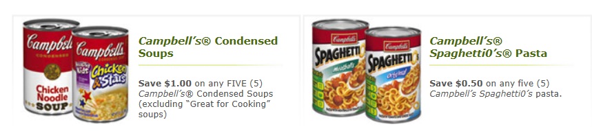 Campbell’s website has added some new coupons, including $1/5 condensed soup and a SpaghettiO’s coupon.  We buy both, so these coupons are looking good to us!  (Our nephews love the SpaghettiO’s, so they are a special request item from them when they visit).
