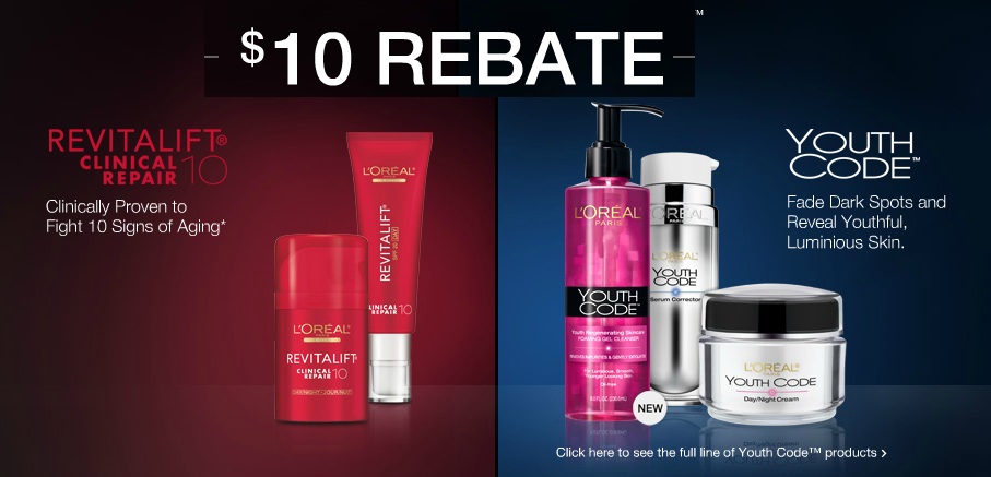 Get a $10 rebate when you spend $30 on Youth Code or ReviaLift Clinical Repair 10 products. Get your rebate form here.