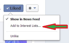 As you hover your cursor over “liked” a drop down menu will appear. Click “Add to Interest Lists…”