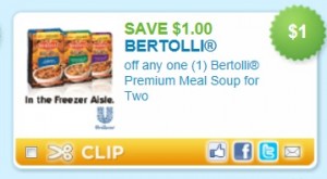 There is a $1 off Bertolli premium soup coupon you can print here. You can print it twice. (use zip code 12345 if you can not see it).