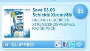 Save $3 on 1 Schick Xtreme3 Disposable Razor pack with this coupon. You can print this twice per computer.