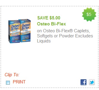 There is a nice high value $5 off Osteo BiFlex coupon out, and you can print it twice. It is good on Osteo Bi-Flex® Caplets, Softgels or Powder (Excludes Liquids). These often go on sale BOGO at Walgreens and Rite Aid, so with two printed coupons you are already saving $10 off the price. This is a really nice coupon & will go quickly, so we encourage early printing! (click the coupon, or this link to be taken to the coupon printing page).